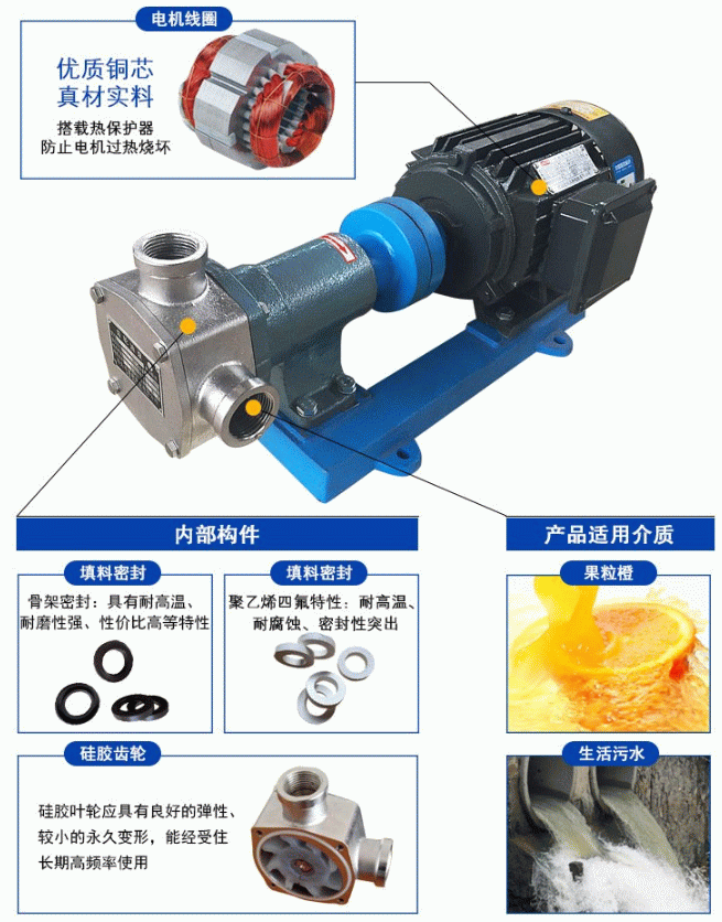 9、現(xiàn)葉輪有兩種材質(zhì)——衛(wèi)生級丁腈膠、三元乙丙膠;丁腈葉輪主要用于植物油、礦物油、含油介質(zhì)及衛(wèi)生要求較高的;乙丙輪主要用于弱無機酸、酸、堿、鹽、醇、酮、污水等廣泛的介質(zhì)。